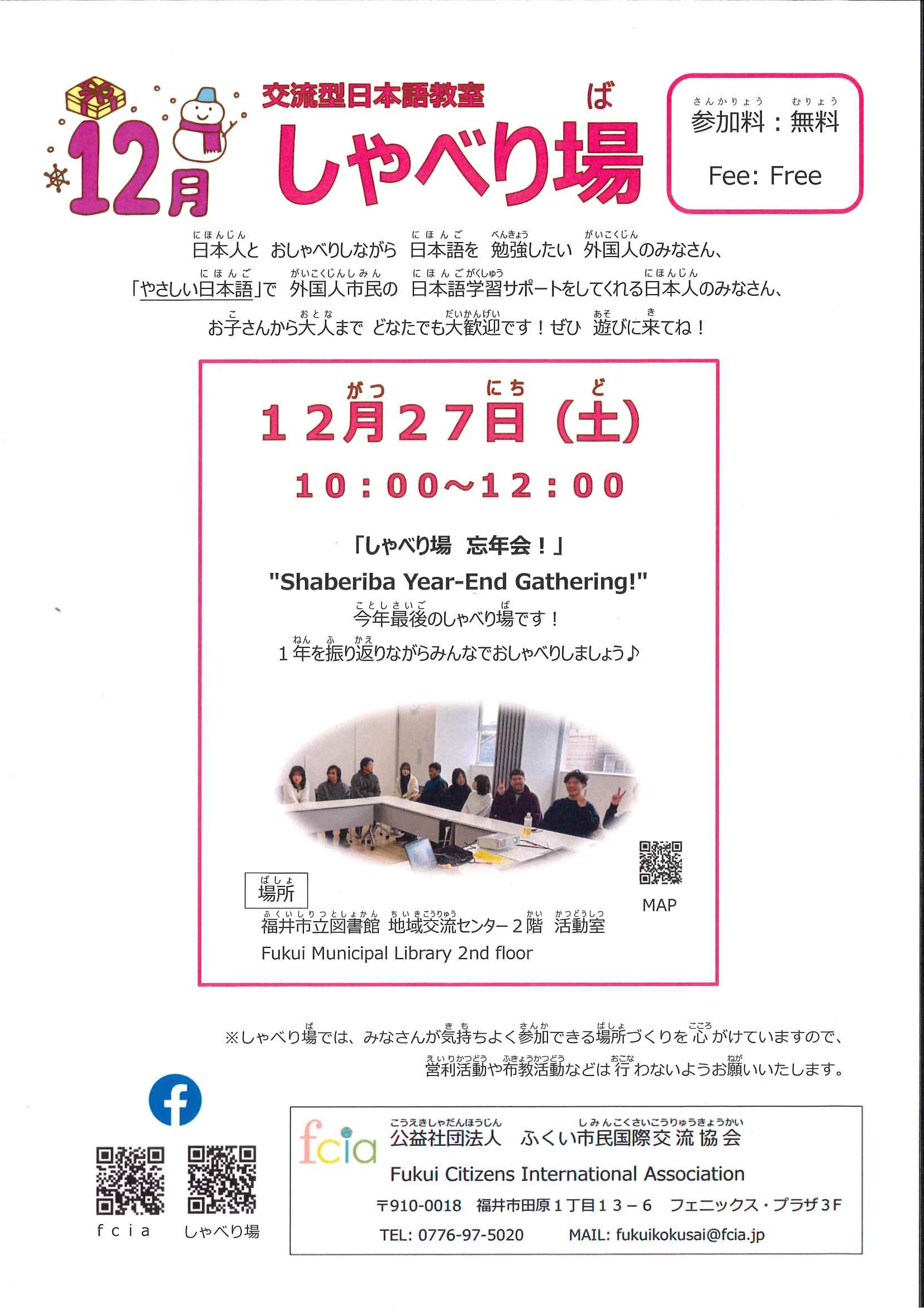 しゃべり場(Shaberiba)は、外国人市民(がいこくじんしみん)が、日本人市民(にほんじんしみん)と、交流(こうりゅう)を 楽(たの)しみながら、テーマに沿(そ)って、日本文化(にほんぶんか)を知(し)り、「読(よ)む、書(か)く、聞(き)く、話(はな)す」ことを、学(まな)ぶことができる "場所(ばしょ)" です。