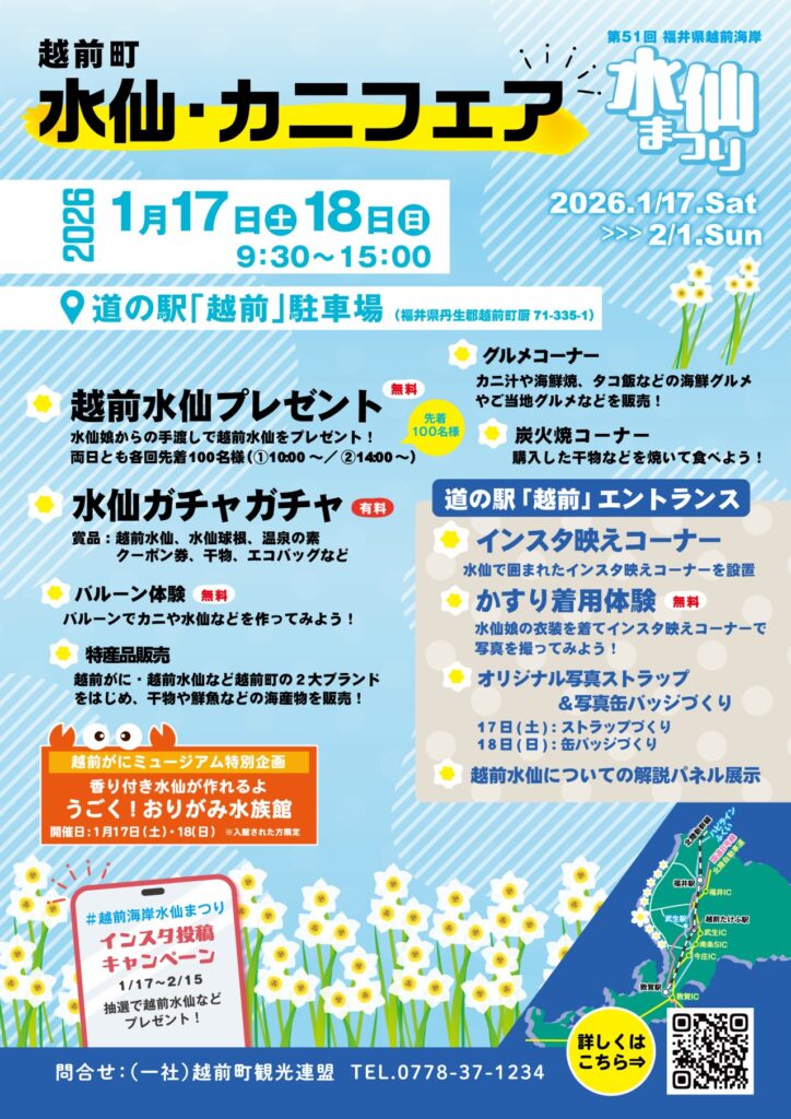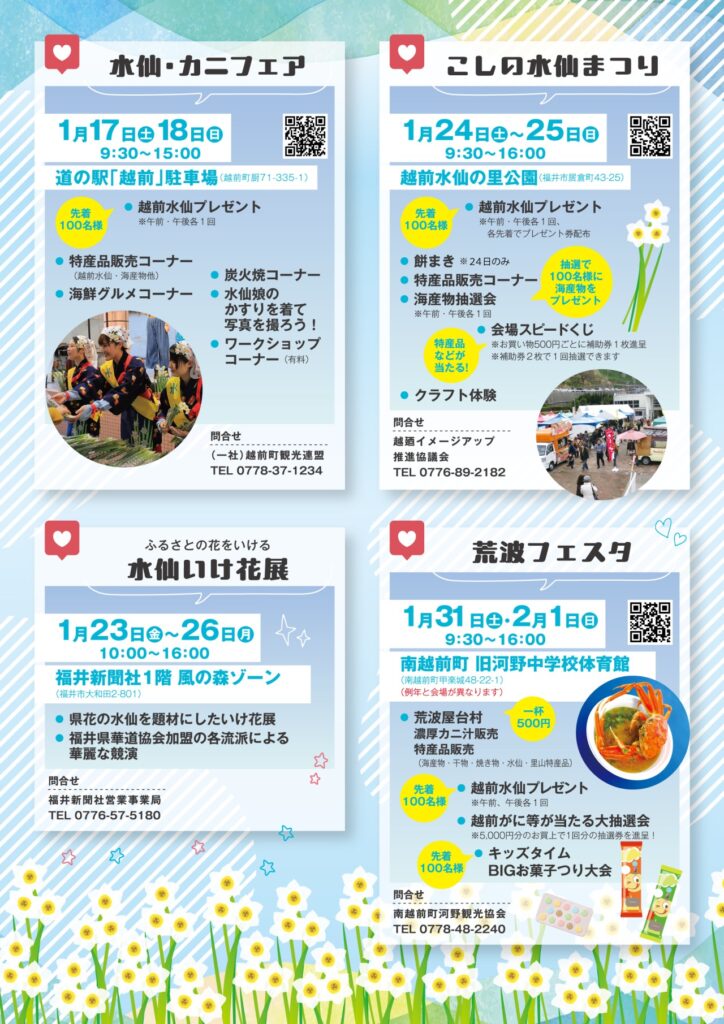 - 越前水仙(えちぜんすいせん)プレゼント: 水仙娘(すいせんむすめ)から直接(ちょくせつ)水仙(すいせん)がもらえます。(各回(かくかい)先着(せんちゃく)100名様(めいさま)/①10:00〜 ②14:00〜)